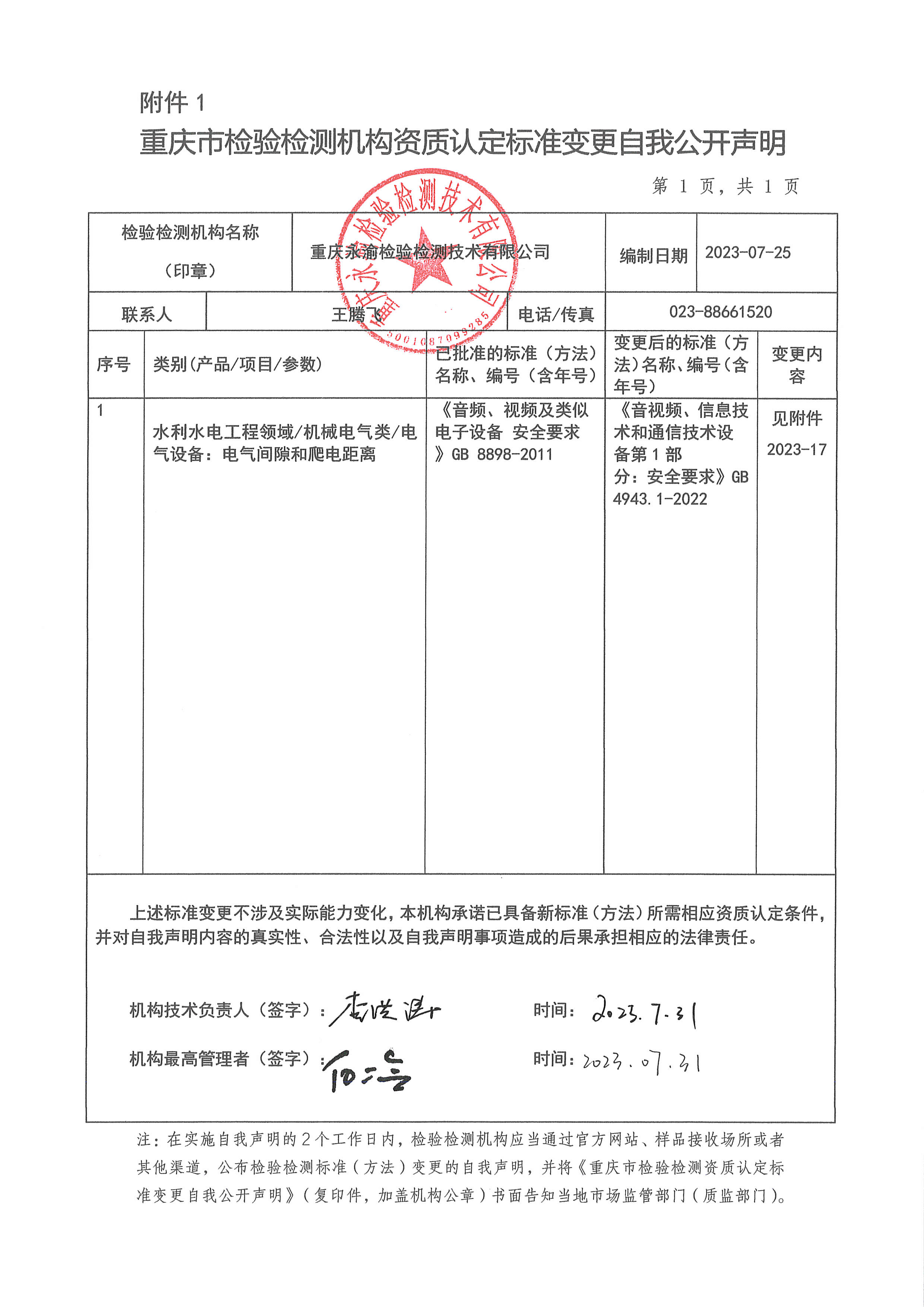 重庆市检验检测机构资质认定标准变更自我公开声明