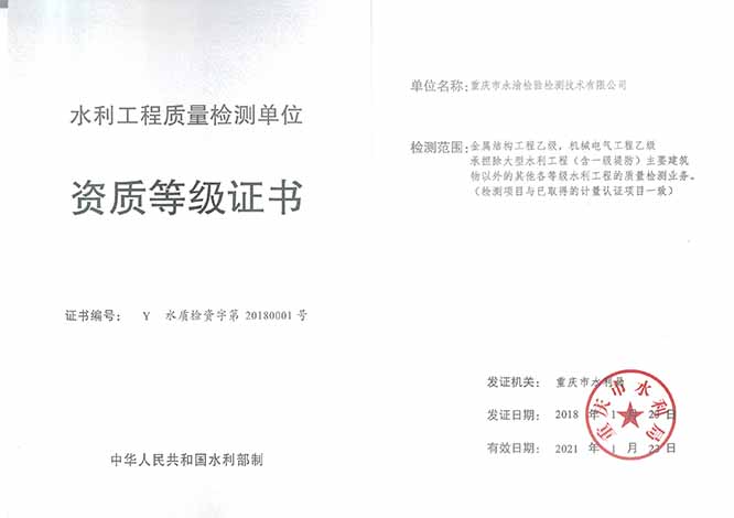 2018年1月8日,重庆市水利局正式公布决定我司水利工程质量检测单位金属结构类、机械电气类乙级资质证书。自此,我司已取得水利工程质量检测资质所有检测类别:混凝土工程类甲级、岩土工程类甲级、量测类甲级、金属结构类乙级、机械电气类乙级五项水利资质。
