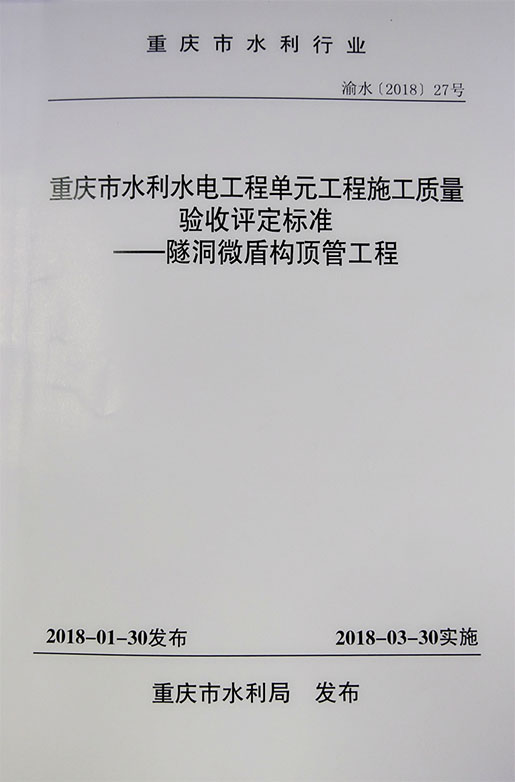我市水利建设工程在输水隧洞施工中引进了微盾构顶管施工技术,这一新的施工工艺目前在国内尚无相应的水利工程施工质量检验与评定标准。为了加强微盾构顶管施工质量管理,保证工程施工质量,统一其单元工程验收与评定标准,规范单元工程验收评定工作,重庆市水利工程质量监督中心站根据市水利局的统一部署,组织相关单位编写《重庆市水利水电工程单元工程施工质量验收评定标准——隧洞微盾构顶管工程》。