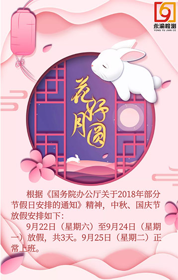 在2018中秋佳节即将到来之际,重庆永渝检验检测技术有限公司祝福社会各界朋友、广大客户及全体员工节日快乐!花好月圆人团圆,浓浓情意送祝福!祝福您及家人中秋节快乐!