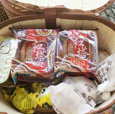 开心地展示自己的中秋礼品