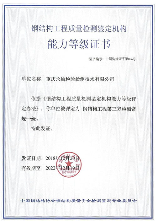 2018年12月11日至12日,中国钢构协会钢结构质量安全检测鉴定专业委员会组织专家对我司进行了钢结构第三方检测能力技术服务进行评审。 2018年12月20日,依据《钢结构工程质量检测鉴定机构能力等级评定办法》,我司被评定为钢结构工程第三方检测常规一级,证书编号为:中钢构检证字第026号。 此次钢结构工程第三方检测(鉴定)机构能力等级评定的顺利通过,是永渝检测公司实力的最好体现,为永渝检测在钢结构工程第三方检测领域的发展起到关键性作用。